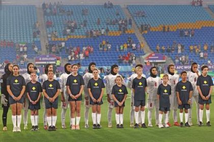 ▲ El ambiente fue sombrío ayer mientras se escuchaba el himno nacional de Irán y su selección femenil permanecía de…