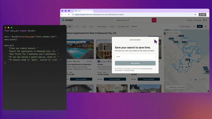 En uno de los ejemplos que ha compartido Amazon, se observa que los desarrolladores pueden instruir a Nova Act para que ingrese a un sitio web en busca de apartamentos para rentar. La inteligencia artificial puede seleccionar diferentes parámetros en los filtros de la página (la ubicación, la cantidad de dormitorios y baños, etc.), y cambiar la vista de los resultados obtenidos. Pero no solo eso, ya que también se puede instruir al agente para que cierre las ventanas emergentes que ofrecen descuentos, que rechace promociones específicas o que descarte los banners sobre el uso de cookies, entre otras posibilidades.