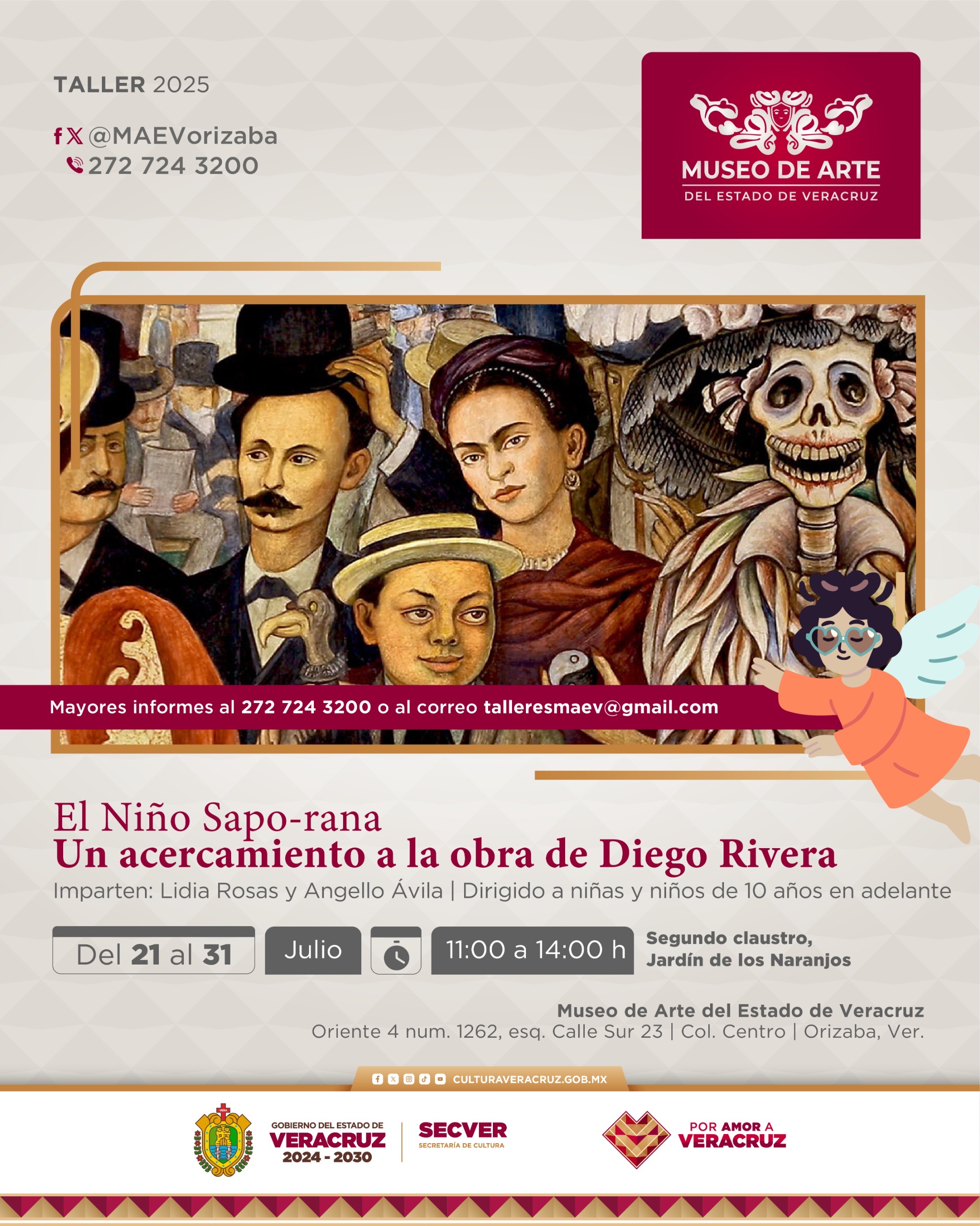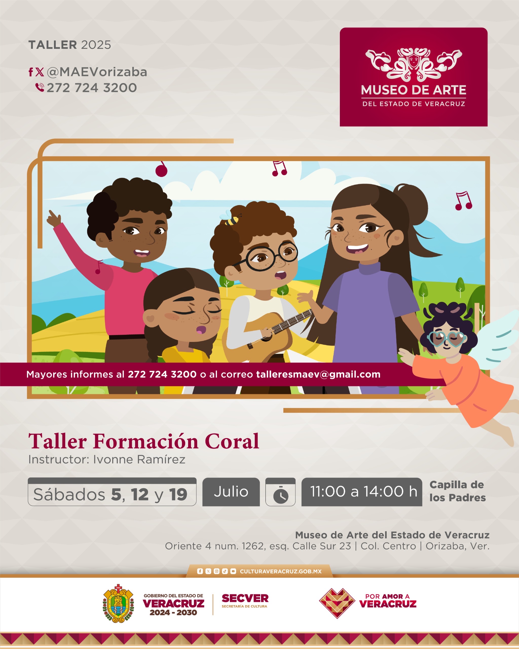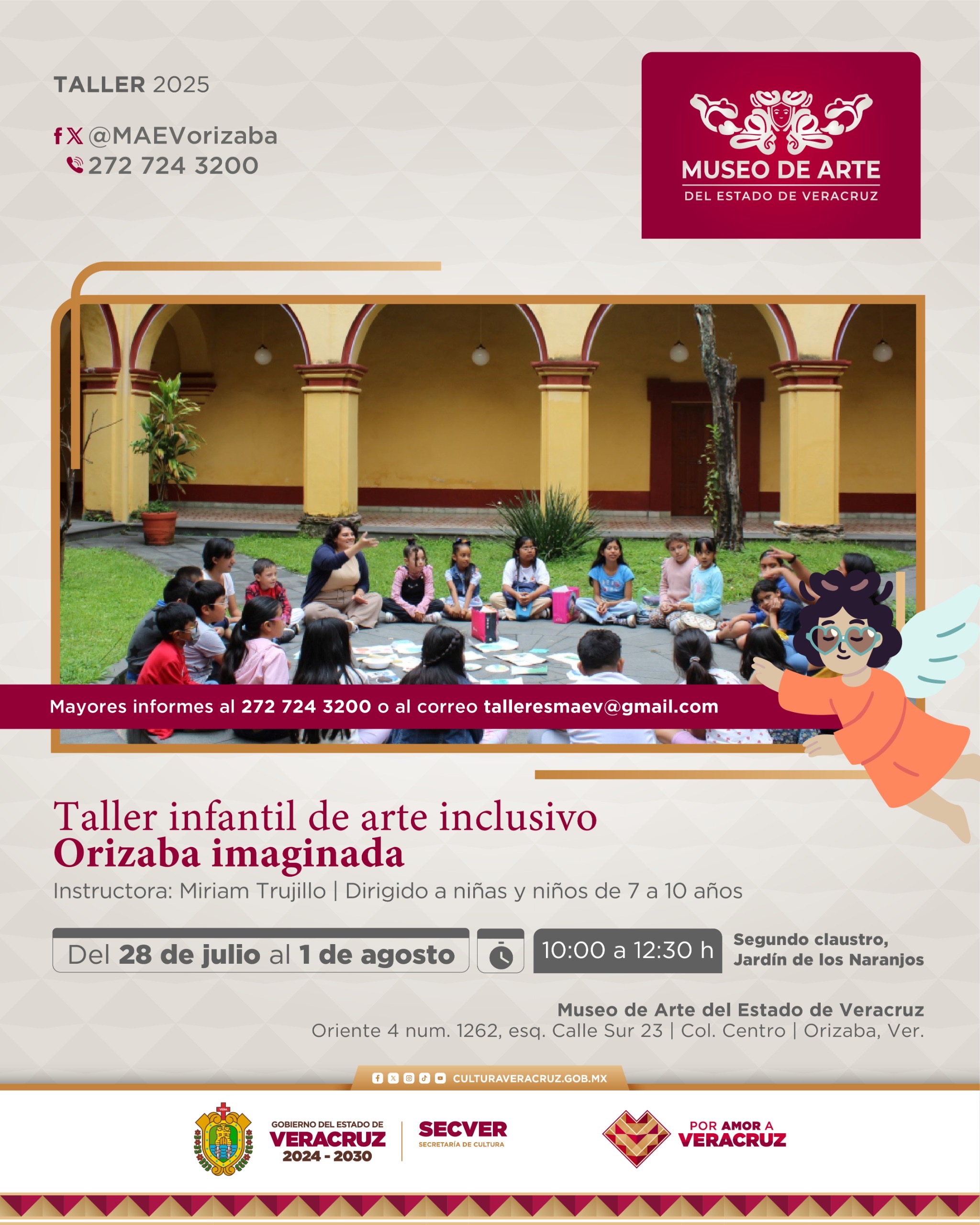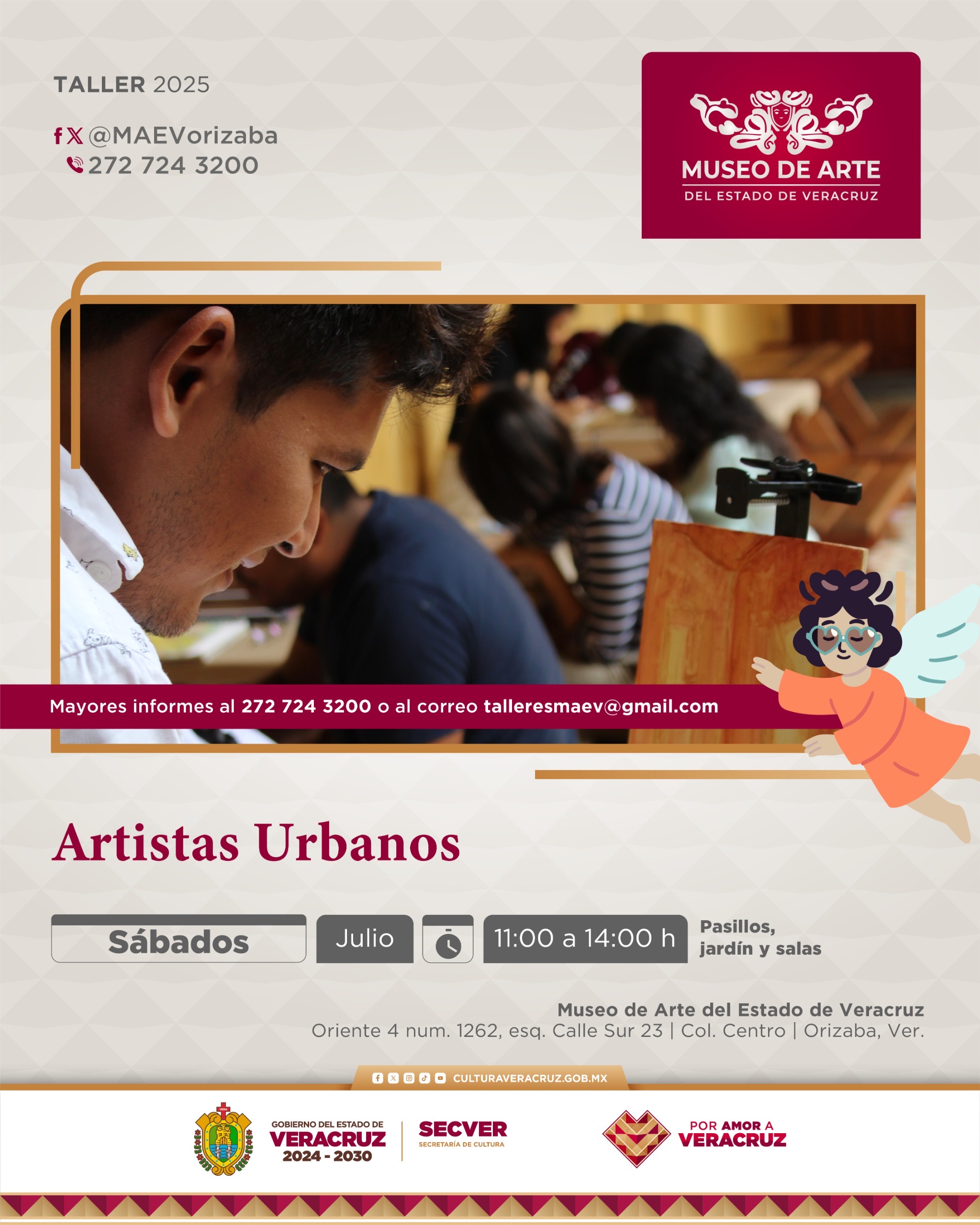 Consulta la información específica de cada uno de los talles y otras actividades del recinto en @MAEVorizaba, al número de teléfono 272 724 3200 o envía un correo electrónico a talleresmaev@gmail.com. Sigue las redes oficiales de la @SECVERoficial para conocer por quéVeracruz está de moda.