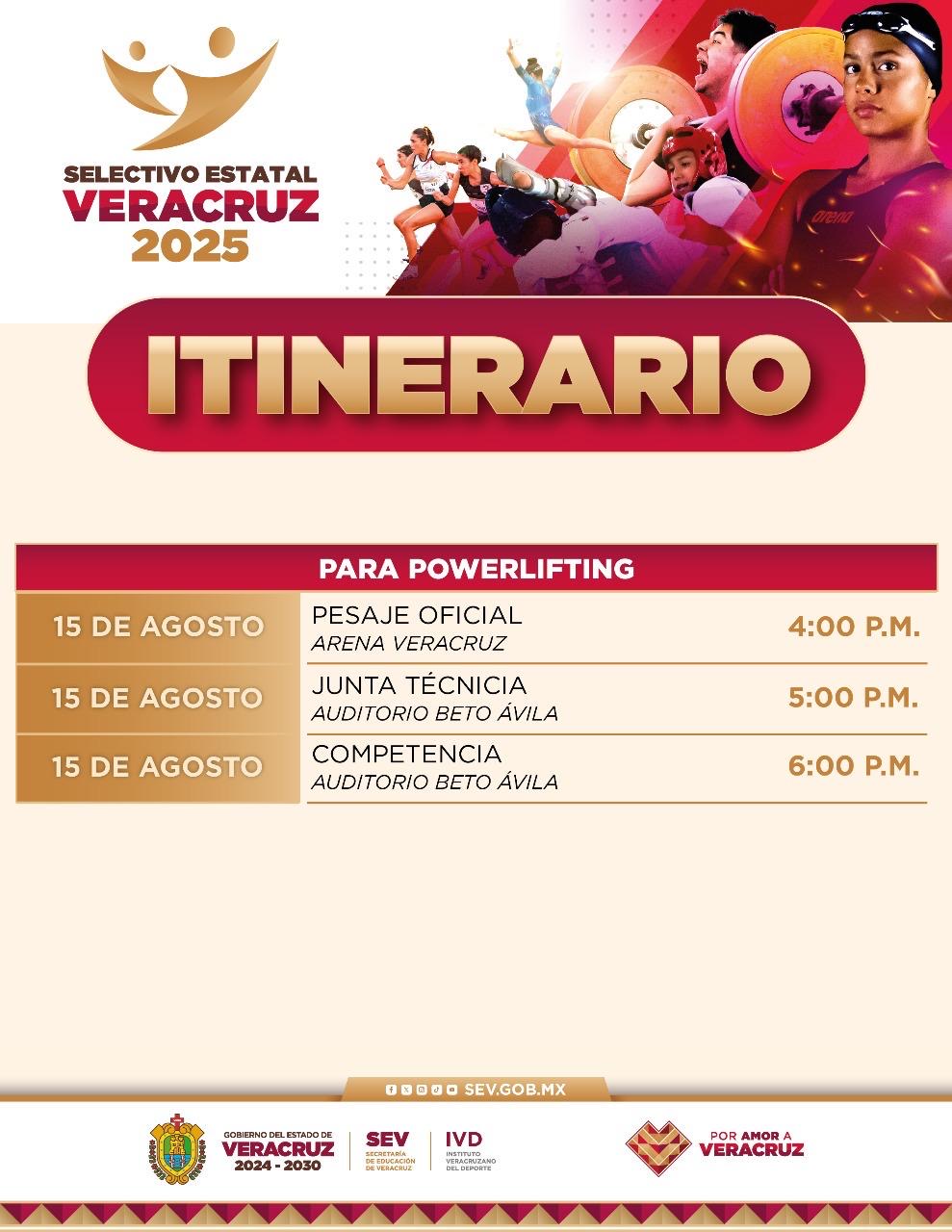 Para Powerlifting: pesaje a las 16:00 horas en la Arena Veracruz, Junta Técnica a las 17:00 e inicio de pruebas a las 18:00 en el Auditorio Beto Ávila.