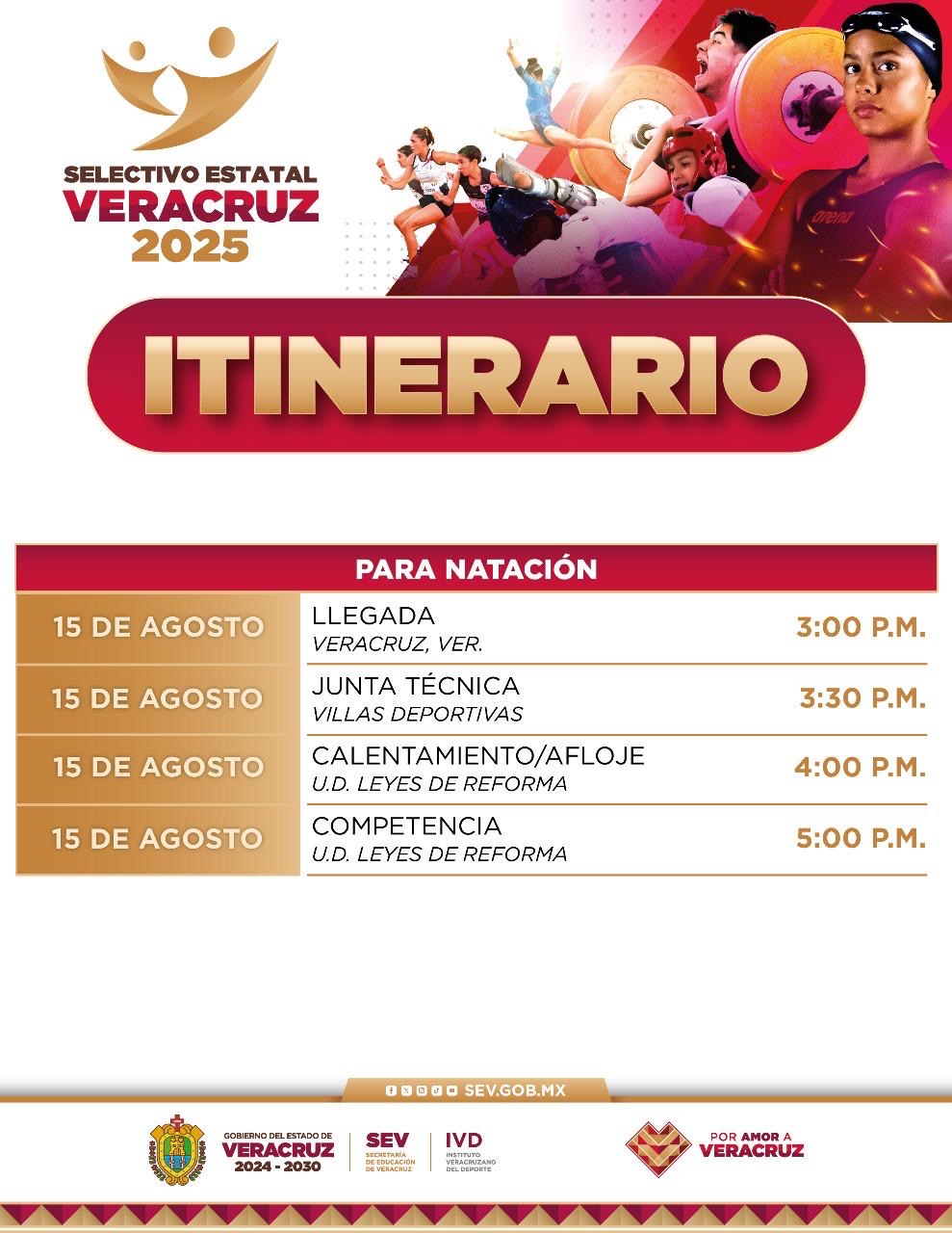 Para Natación: llegada de competidores a las 15:00 horas, Junta Técnica a las 15:30, calentamiento a las 16:00 e inicio de competencia a las 17:00 en la alberca de Leyes de Reforma.