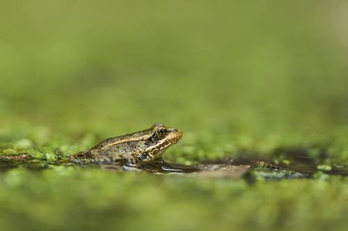 ▲ Una ranita de patas rojas se asoma en un estanque de restauración.Foto Afp