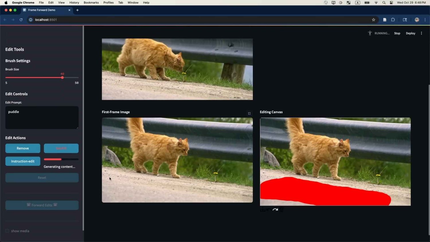 Project Frame Forward también admite edición con ayuda de instrucciones de texto. El usuario puede extraer el fotograma y dibujar una máscara en la parte del video en donde quiere añadir o eliminar cosas. Posteriormente, solo necesitará escribir el prompt en el cuadro de texto ubicado en la barra lateral para generar el objeto que se propagará a lo largo de todo el video.