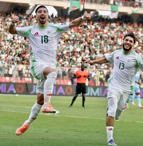 La selección de Argelia regresará a una Copa del Mundo después de 12 años, tras golear 3-0 a Somalia y confirmar su lugar en la edición 2026 que se realizará de México, Estados Unidos y Canadá. Los argelinos se convirtieron en el cuarto equipo clasificado de África después de que también lo hicieran Marruecos, Túnez y Egipto. En la imagen, Mohamed Amoura, quien marcó doblete, y Jaouen Hadjam celebran su clasificación a la justa mundialista.