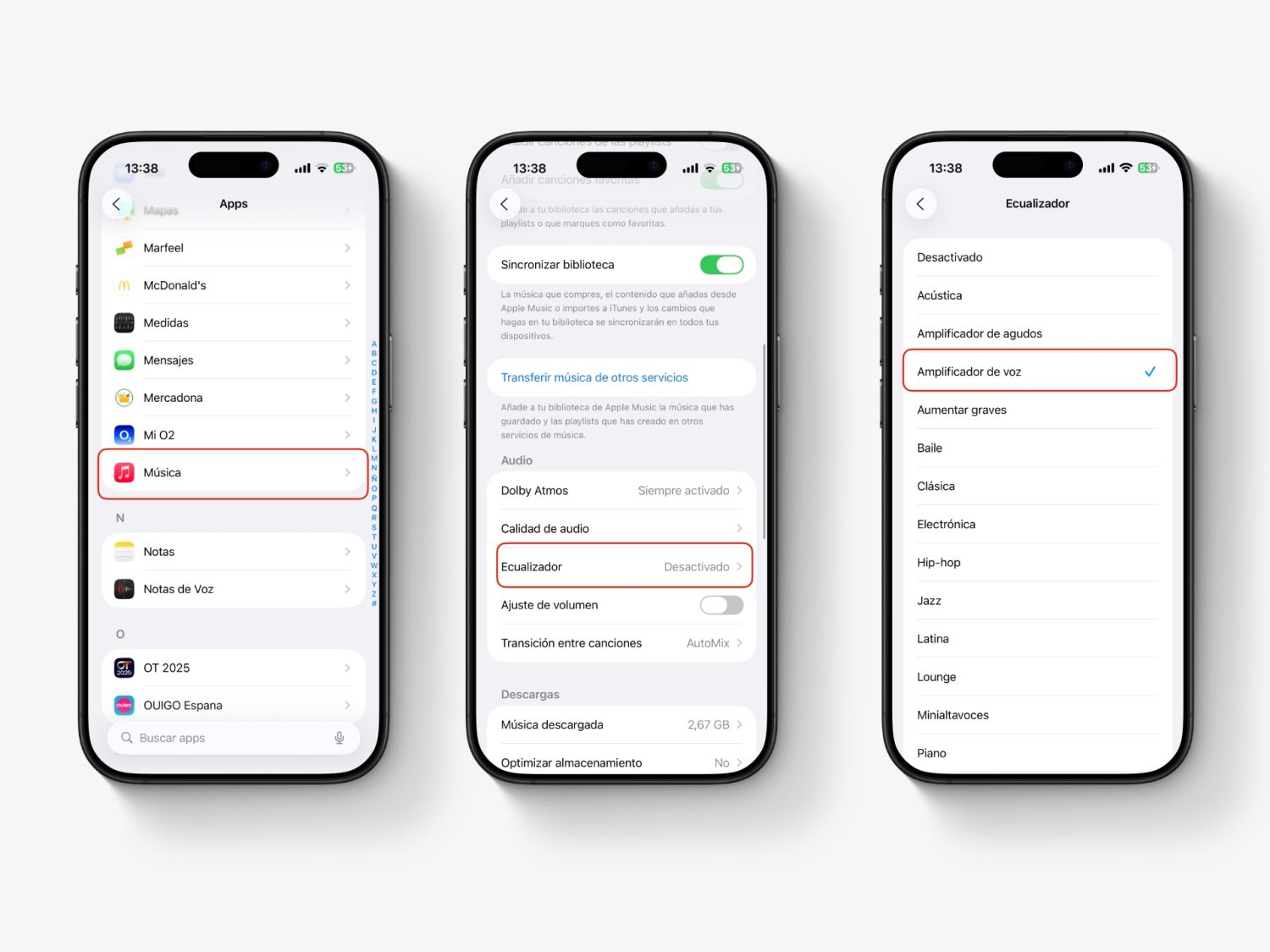 Para ello, ve a Ajustes > Aplicaciones > Música > Ecualizador. A continuación, selecciona ‘Amplificador de voz’ para que los auriculares tengan un sonido similar a los AirPods o Beats de Apple y se cree una mejor calibración entre las voces y las melodías. Si no te gusta este ajuste, puedes seleccionar cualquiera de los otros disponibles e ir probando el que más se adapte a tus necesidades.