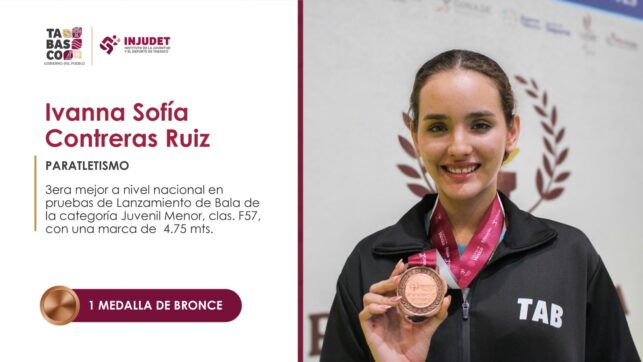 “Felicitamos a Romina Ledezma Mimendi, quien ganó tres medallas de oro y se convirtió en tricampeona nacional en los 100 metros planos, 200 metros planos y lanzamiento de jabalina, así como a Ivanna Sofía Contreras Ruiz, quien obtuvo medalla de bronce en lanzamiento de bala, colocándose como la tercera mejor a nivel nacional”, indicó.