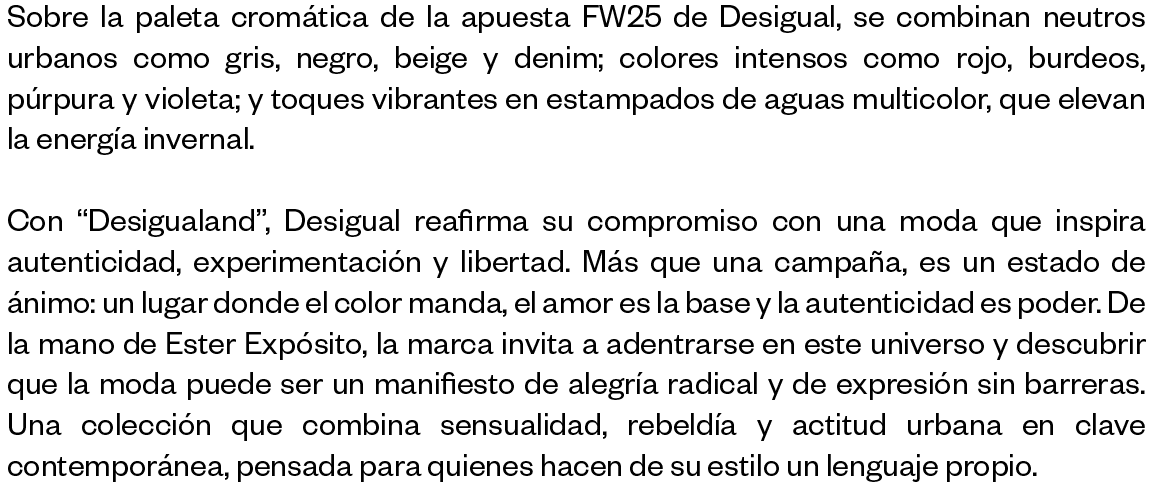 La colección FW25 protagonizada por Ester Expósito ya está disponible en tiendas seleccionadas de Desigual y en desigual.com.