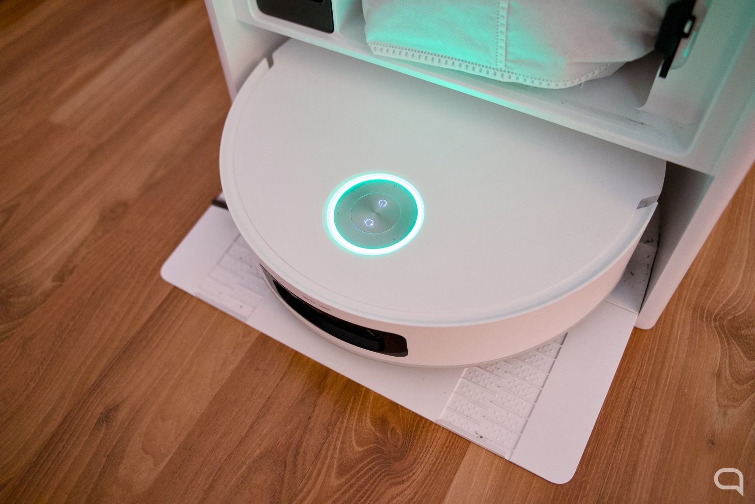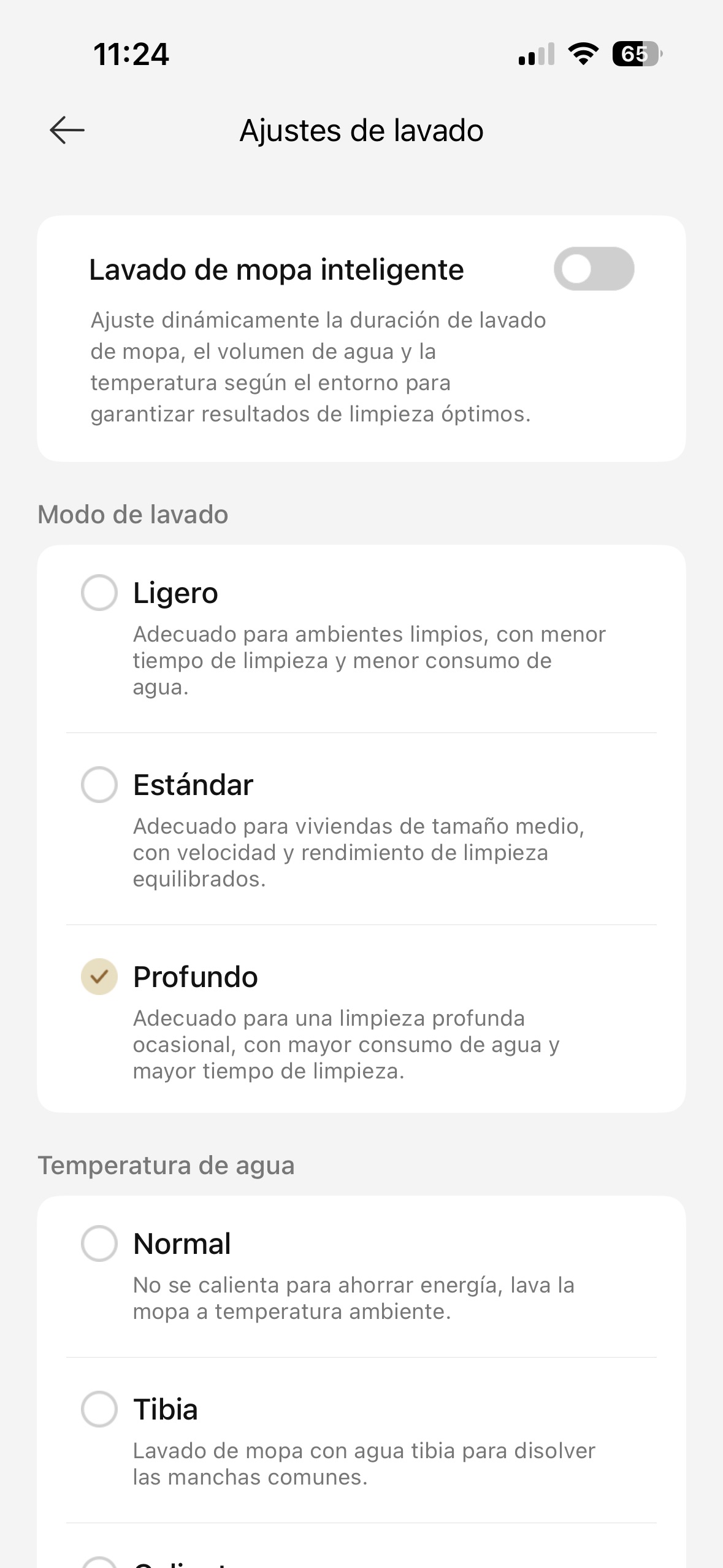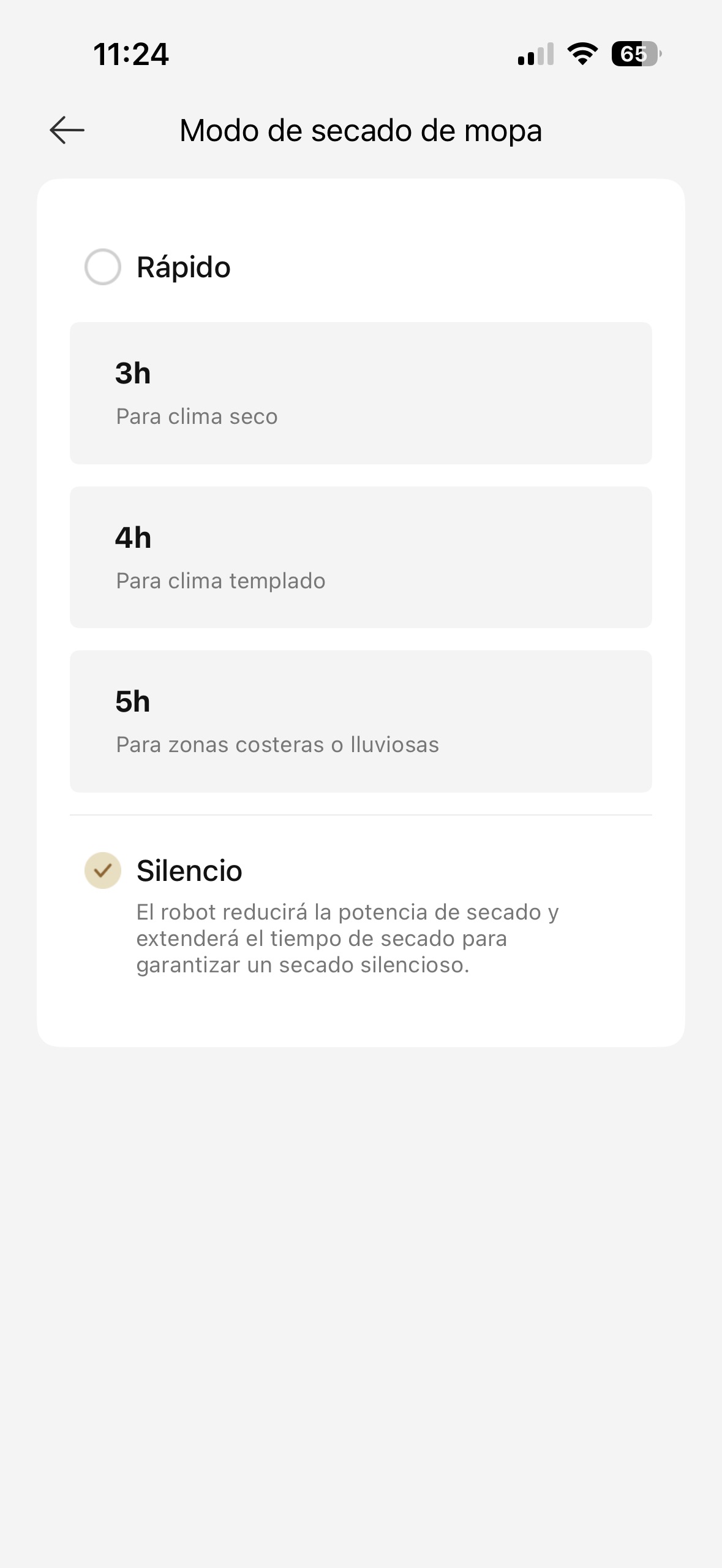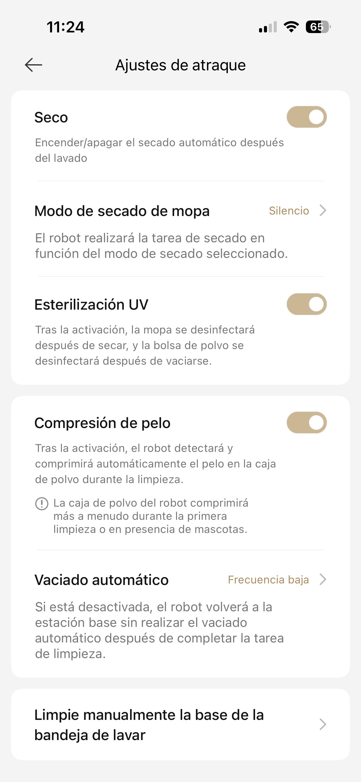 El proceso de limpieza de mopa es rápido, apenas unos minutos en función de la opción que tengamos seleccionada: automática o con la opción de limpiarla ligeramente o profundamente, así como elegir la temperatura del agua a lo que lo hará o si queremos limpiarla o no con detergente. Otra cosa es el sistema de secado, que en función de nuestra selección le puede tomar algo tan corto como 3 horas hasta más de 8 horas, aunque no hace apenas ruido (excepto cuando va rotando el sistema) y te puedes olvidar de él totalmente. Y, se nota que el sistema limpia con agua muy caliente la mopa, pues si te acercas a la base cuando lo está haciendo puede sentir la temperatura mientras se limpia la mopa.