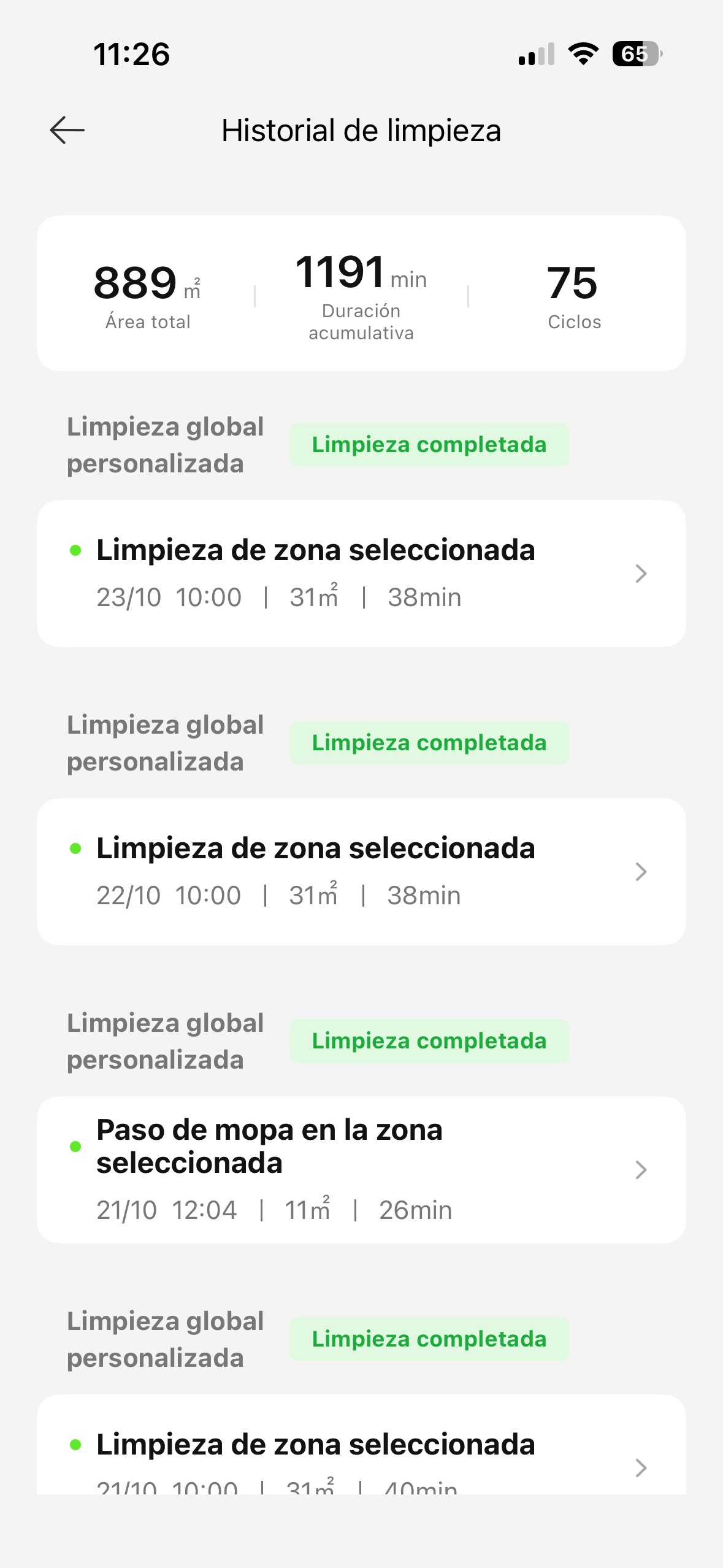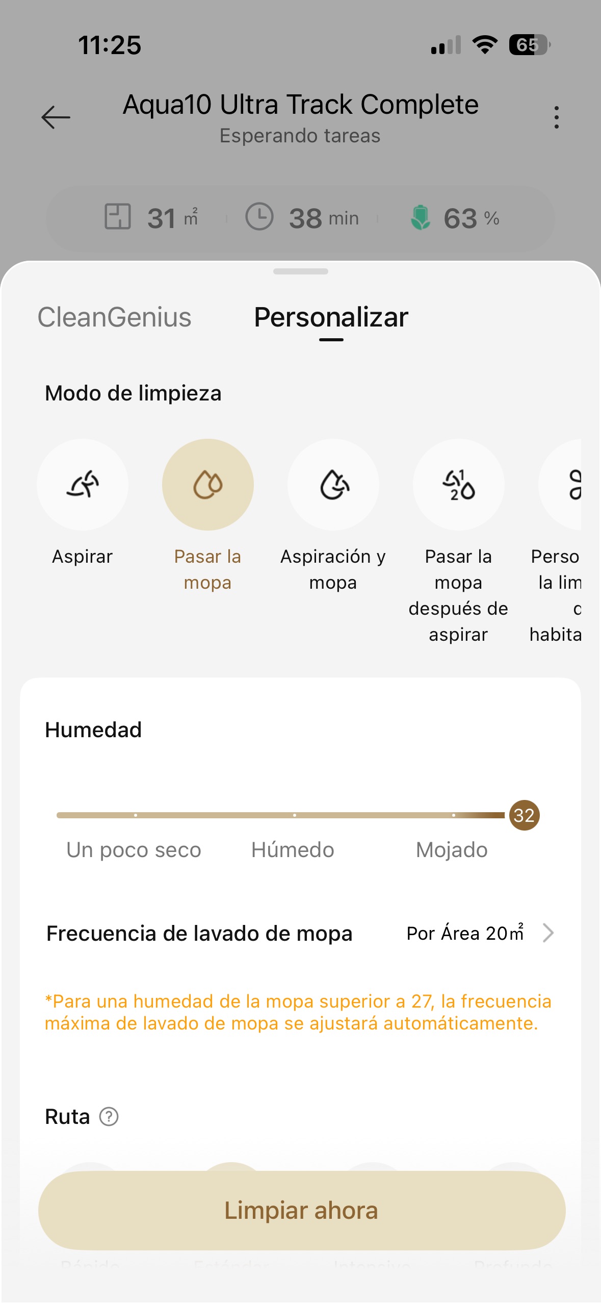 Es bastante rápido en sus tareas y capaz de limpiar unos 90 m² en apenas media hora usando sus funciones inteligentes, aunque su función CleanGenius se toma más tiempo si cree que está más sucio o tiene que hacer varias pasadas. No hay problema a este respecto porque en todo el tiempo que la hemos probado, su batería nuca ha bajado del 45%, pese a que tenemos activa la función de que solo cargue al 80% para preservar su salud.
