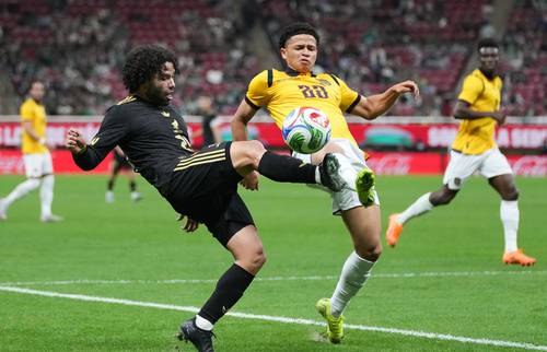 ▲ El mexicano César Huerta (izquierda) y el ecuatoriano Patrik Mercado compiten por el balón en un partido amistoso en Guadalajara.Foto Afp