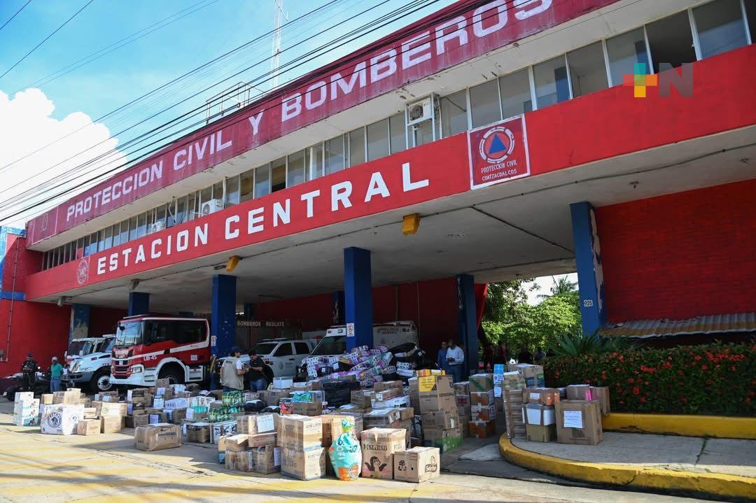 Coatzacoalcos, Ver.- Los víveres recolectados en el centro de acopio instalado en la Unidad de Bomberos y Protección Civil de Coatzacoalcos fueron entregados a la Secretaría de Marina (SEMAR), quienes será los encargados de realizar el traslado para su posterior distribución entre las familias afectadas del norte del estado.