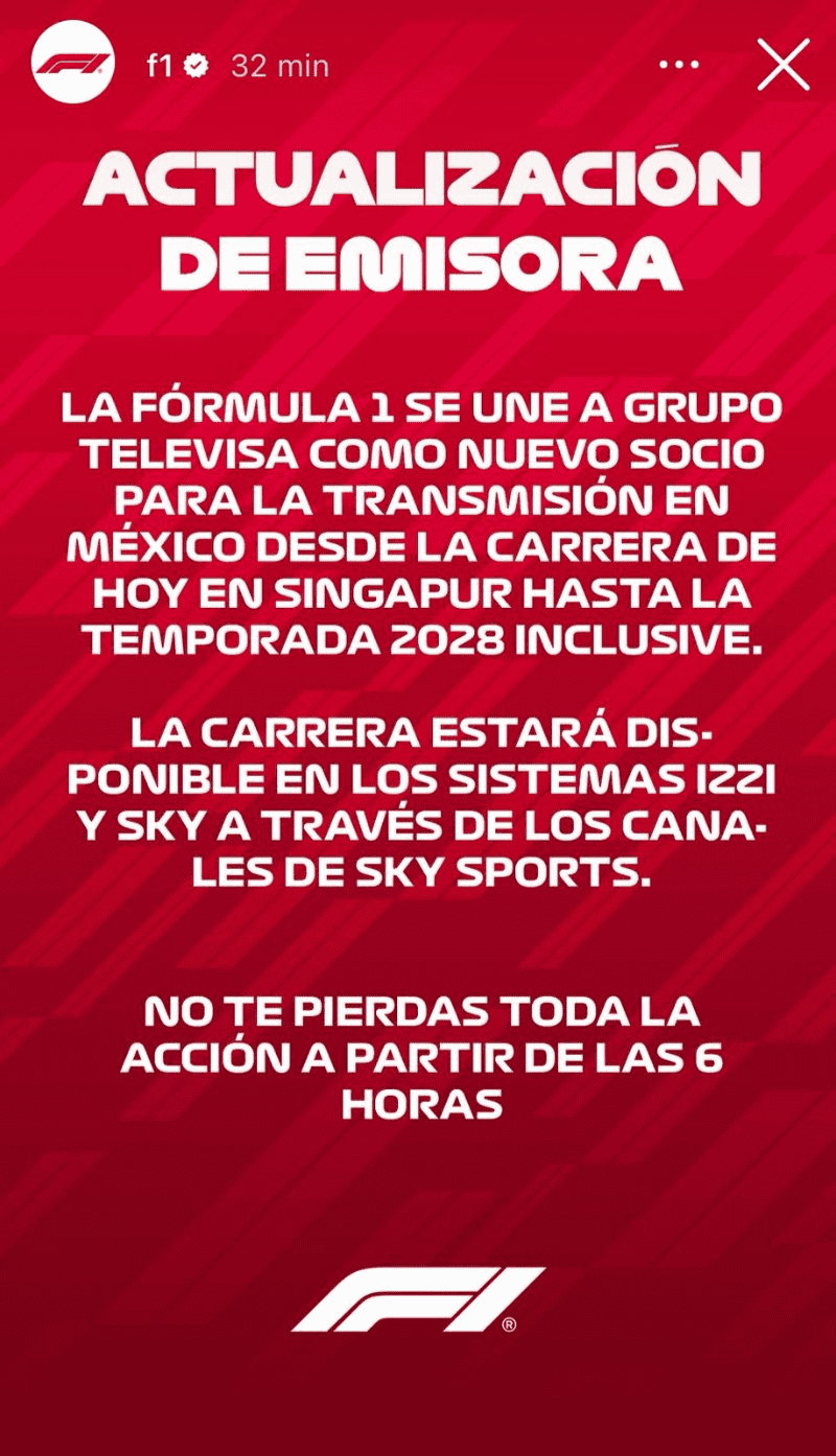 La Fórmula 1 confirmó oficialmente que Fox Sports dejará de transmitir las carreras en México a partir de esta etapa de la temporada. En su lugar, las competencias se podrán disfrutar por Sky Sports e Izzi, además de F1TV, la plataforma oficial que ofrece todas las sesiones en vivo y bajo demanda.