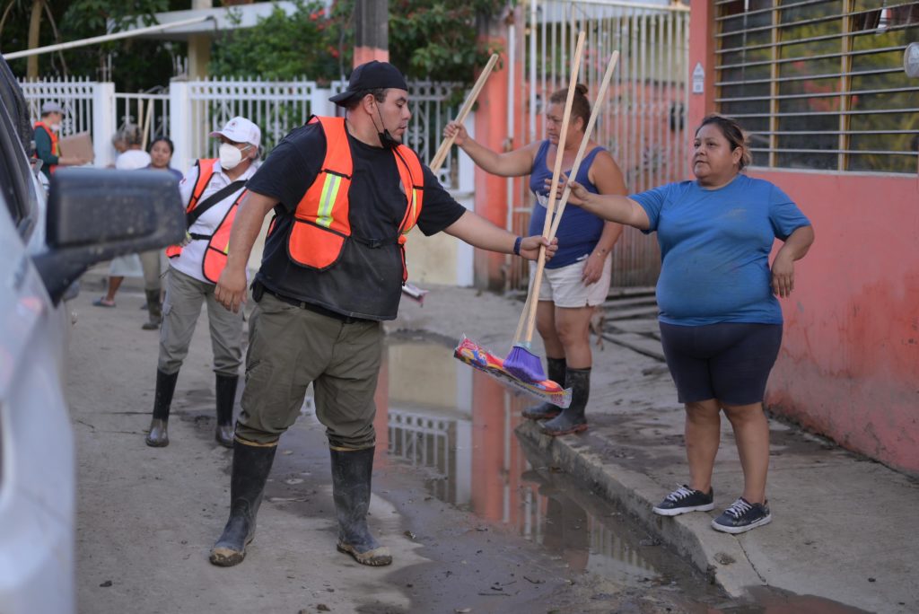 En la bodega de resguardo de insumos, verificó el avance en la entrega de paquetes alimentarios, agua y productos de limpieza, e instruyó a las brigadas a continuar la distribución casa por casa; desde este punto partieron unidades con 527 paquetes alimenticios, 633 litros de agua purificada y 15 galones de desinfectante de 20 litros cada uno, destinados a los hogares más afectados.