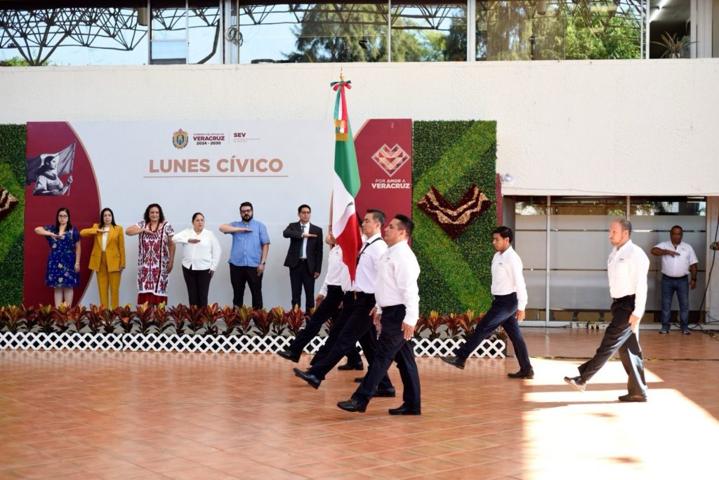 Durante la ceremonia de Lunes Cívico, la titular de la dependencia, Claudia Tello Espinosa, destacó que en Veracruz todos los días se generan buenas noticias en cada trámite que se resuelve, en cada escuela que se mejora y en cada estudiante que recibe atención y oportunidades para su desarrollo.