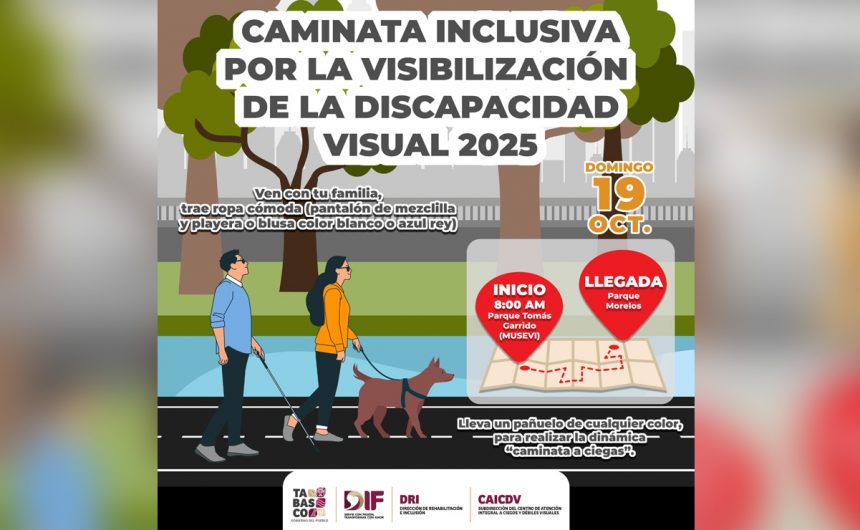 Con el propósito de sensibilizar a las y los ciudadanos sobre los desafíos que enfrentan las personas ciegas en su vida diaria, el Sistema para el Desarrollo Integral de las Familias (DIF) Tabasco convoca a la población a participar, el próximo 19 de octubre, en la Caminata Inclusiva por la Visibilización de la Discapacidad Visual 2025.