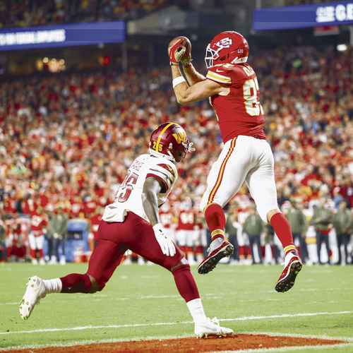 Cuando la ofensiva de Kansas City comandada por Patrick Mahomes entra en ritmo, es casi imposible detenerla. El mariscal de los Jefes guio a su equipo a una victoria de 28-7 sobre los Comandantes de Washington en el partido que se disputó anoche en Arrowhead Stadium. Mahomes, quien registró 299 yardas aéreas, conectó tres envíos a las diagonales con sus receptores: Rashee Rice, Xavier Worthy y con el ala cerrada, Travis Kelce (a la derecha en la imagen), quien llegó a 100 pases de anotación atrapados en su carrera.