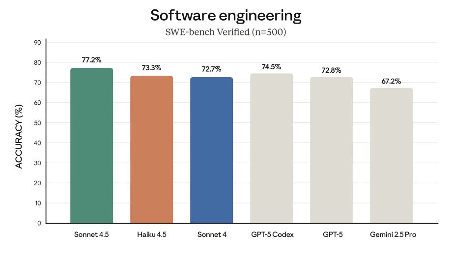 En las pruebas de ingeniería de software de SWE-Bench, Claude Haiku 4.5 obtiene un rendimiento mayor a Claude Sonnet 4 y ligeramente menor a la versión 4.5. En este benchmark también supera a GPT-5, mientras que en la programación agéntica centrada en la línea de comandos consigue un mejor porcentaje que Gemini 2.5 Pro y Claude Sonnet 4.