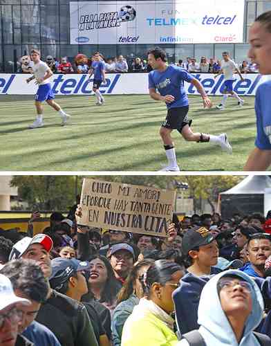 ▲ Este año, el piloto mexicano (arriba al centro) cambió la pista por la cancha de futbol y acudió a compromisos comerciales en el contexto de Gran Premio de México, donde fue ovacionado por cientos de seguidores.Foto @escuderiatelmex y Marco Peláez