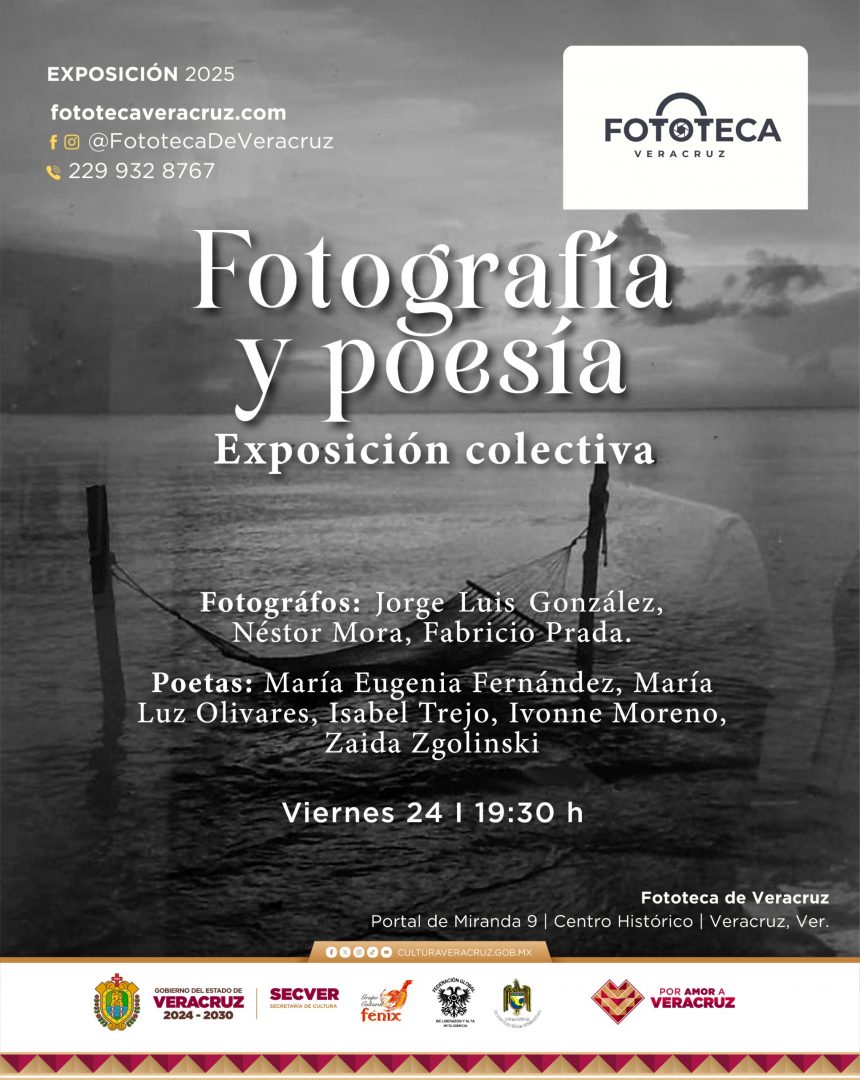 Xalapa, Ver.- La Secretaría de Cultura de Veracruz (SECVER), en colaboración con el Grupo Cultural Fénix, la Federación Global de Liderazgo y Alta Inteligencia y la Academia Nacional de Historia y Geografía de la UNAM, invita a la inauguración de la exposición Fotografía y Poesía que se realizará el día hoy a las 19:30 horas, en la Fototeca Veracruz. La entrada es gratuita.