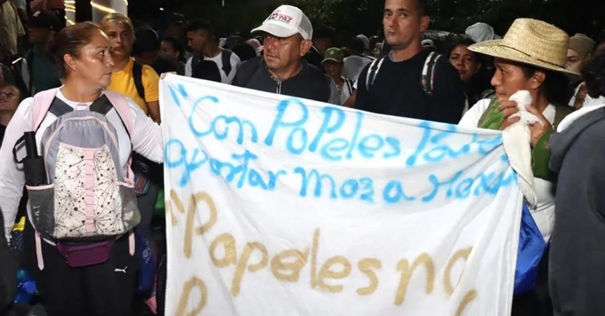 Con una manta como estandarte con la leyenda “Con papeles podemos aportar más a México”, los migrantes tienen marcado seguir por la costa de Chiapas y pasar por los municipios de Huehuetán, Huixtla, Villa Comaltitlán, Escuintla, Mapastepec, Pijijiapan, Tonalá y Arriaga.