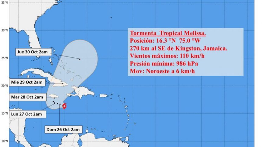 “El sistema se está organizando para arrancar como un huracán”, dijo en la rueda de prensa la directora del Indomet, Gloria Ceballos. De acuerdo con el último reporte del Centro Nacional de Huracanes (NHC, en inglés) estadounidense, Melissa golpearía como huracán a Jamaica el martes y a Cuba el miércoles.
