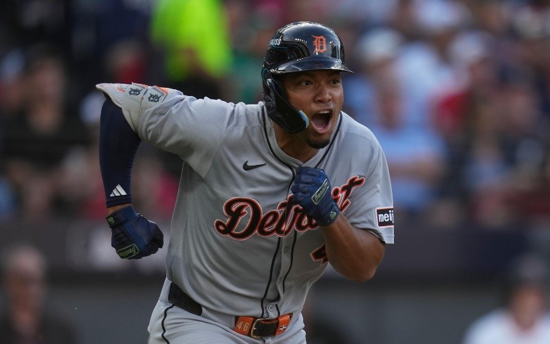 Wenceel Pérez de los Tigres de Detroit corre a primera base tras batear un sencillo productor de dos carreras. AP/S. Ogrocki