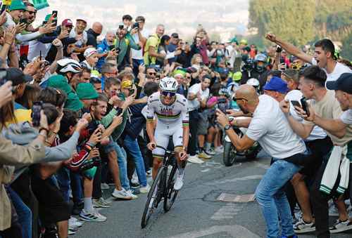 A 36 kilómetros de la meta, en el ascenso de Passo di Ganda, Pogacar estalló para ofrecer el último recital de la temporada. Se escapó solo, dejó atrás a Quinn Simmons, un gringo loco que durante 50 kilómetros se puso en fuga y resistió hasta que la élite lo postergó al cuarto puesto.