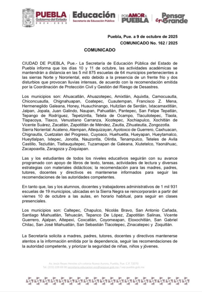 También la Secretaría de Educación de Puebla detalló que las clases y actividades académicas serán a distancia este viernes y sábado en 64 municipios de las sierras Norte y Nororiental.