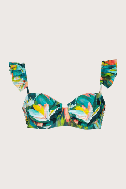 Lucera es libertad visual. Su diseño bandeau de un solo hombro enmarca el cuerpo con elegancia asimétrica, mientras su estampado floral moderno sobre fondo claro inyecta luz, suavidad y movimiento. Es una familia que mezcla sofisticación con espontaneidad.