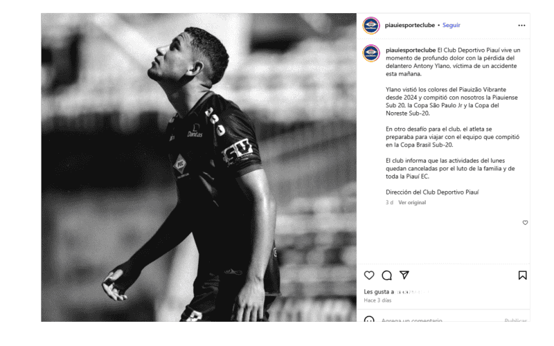 “El Club Deportivo Piauí vive un momento de profundo dolor con la pérdida del delantero Antony Ylano, víctima de un accidente esta mañana”.