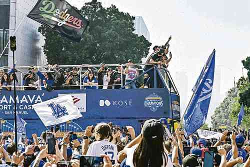 ▲ En la imagen, los bicampeones desfilaron del centro de la ciudad al Dodger Stadium.Foto Afp