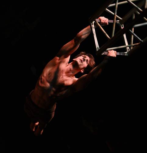 ▲ La trágica historia de amor de Eneas y Dido, de la epopeya de Virgilio, cobra vida a través del circo y la danza contemporáneos. En la imagen, un miembro de la compañía Recirquel durante el acto Walk My World, en el centro cultural Millenaris de Budapest.Foto Afp