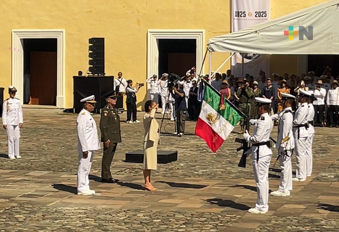 Acompañada por la gobernadora del estado, Rocío Nahle García, la mandataria destacó la importancia de recordar la estrategia naval liderada por el capitán de fragata Pedro Sainz de Baranda, que marcó el nacimiento de la soberanía en el mar.