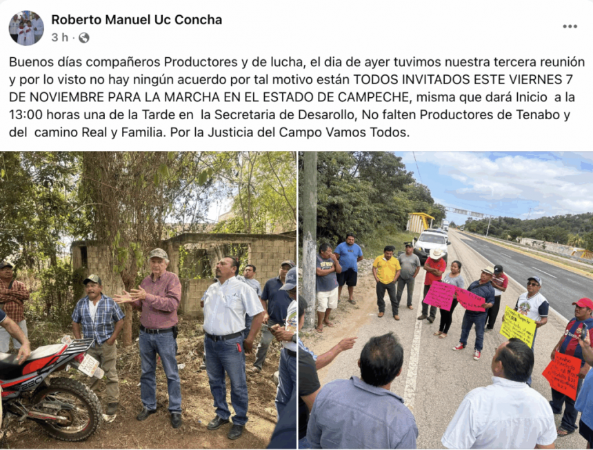 Roberto Uc Concha, uno de los productores inconformes, publicó un mensaje abierto en su cuenta de Facebook para llamar a sumarse: “Buenos días compañeros Productores y de lucha, el día de ayer tuvimos nuestra tercera reunión y por lo visto no hay ningún acuerdo por tal motivo están TODOS INVITADOS ESTE VIERNES 7 DE NOVIEMBRE PARA LA MARCHA EN EL ESTADO DE CAMPECHE, misma que dará Inicio a la 13:00 horas una de la Tarde en la Secretaria de Desarollo, No falten Productores de Tenabo y del camino Real y Familia. Por la Justicia del Campo Vamos Todos”.
