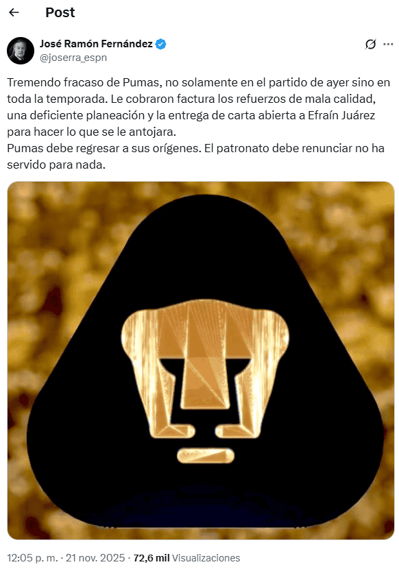 “Tremendo fracaso de Pumas, no solamente en el partido de ayer sino en toda la temporada. Le cobraron factura los refuerzos de mala calidad, una deficiente planeación y la entrega de carta abierta a Efraín Juárez para hacer lo que se le antojara”, escribió en su cuenta de X.