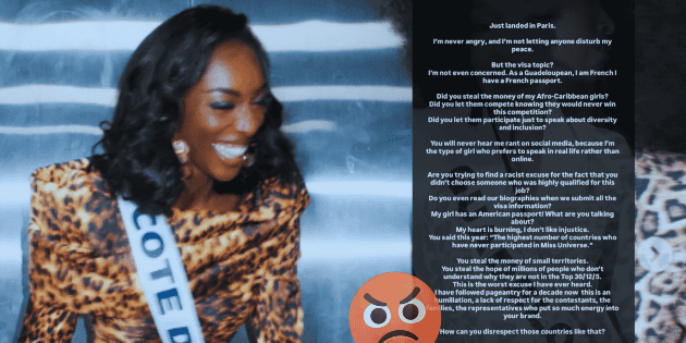 Tras saberse que las dificultades de visado fueron clave para que Olivia Yacé no fuese considerada para quedarse con la corona, Miss Guadalupe no tardó en acusar a la organización de racismo por su marcada exclusión hacia delegadas afrocaribeñas y de territorios pequeños.