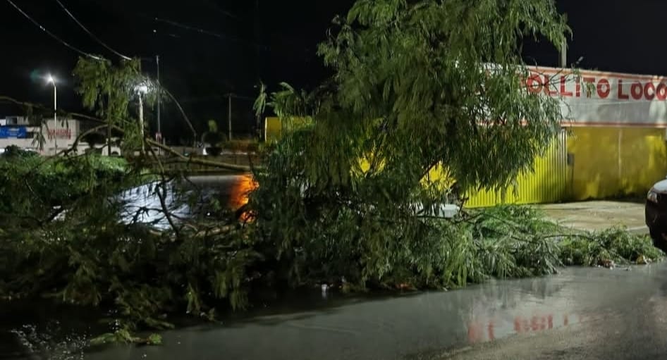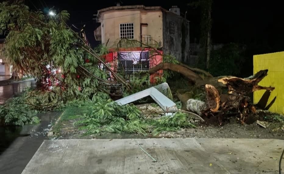 Escárcega.- El domingo, un árbol cayó sobre el tendido eléctrico después de un fuerte aguacero acompañado de rachas intensas de viento, lo que provocó daños en la línea y generó riesgo en la zona.