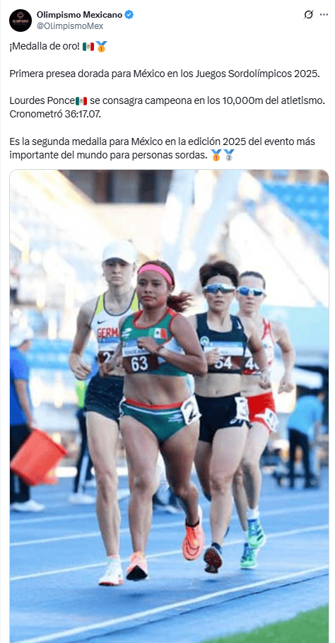 En una jornada histórica para el deporte mexicano, Lourdes Ponce Juárez conquistó el primer oro para México en los Juegos Sordolímpicos Tokio 2025, al coronarse en la final de los 10 mil metros de atletismo con un tiempo de 36:17.07.