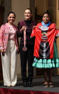 ▲ Ayer durante la presentación de la carrera en Palacio Nacional, la presidenta Claudia Sheinbaum, flanqueada por Beatriz de la Cruz, líder del proyecto México Imparable, y la ultramaratonista Lorena Ramírez, quienes fueron galardonadas anoche con el Premio Nacional del Deporte 2025.Foto Presidencia