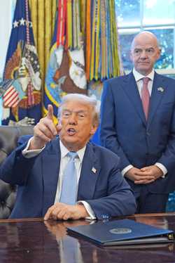 ▲ El mandatario estadunidense (al frente) y Gianni Infantino anunciaron el FIFA Pass.Foto Ap