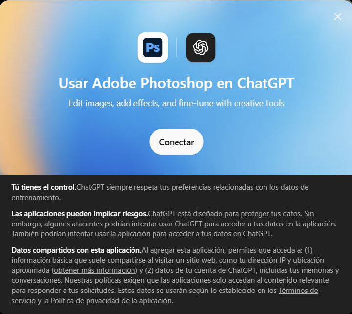 - Haz clic o toca el botón “Conectar” en la nueva ventana que pide habilitar la conexión de Adobe Photoshop (o Acrobat) con ChatGPT.