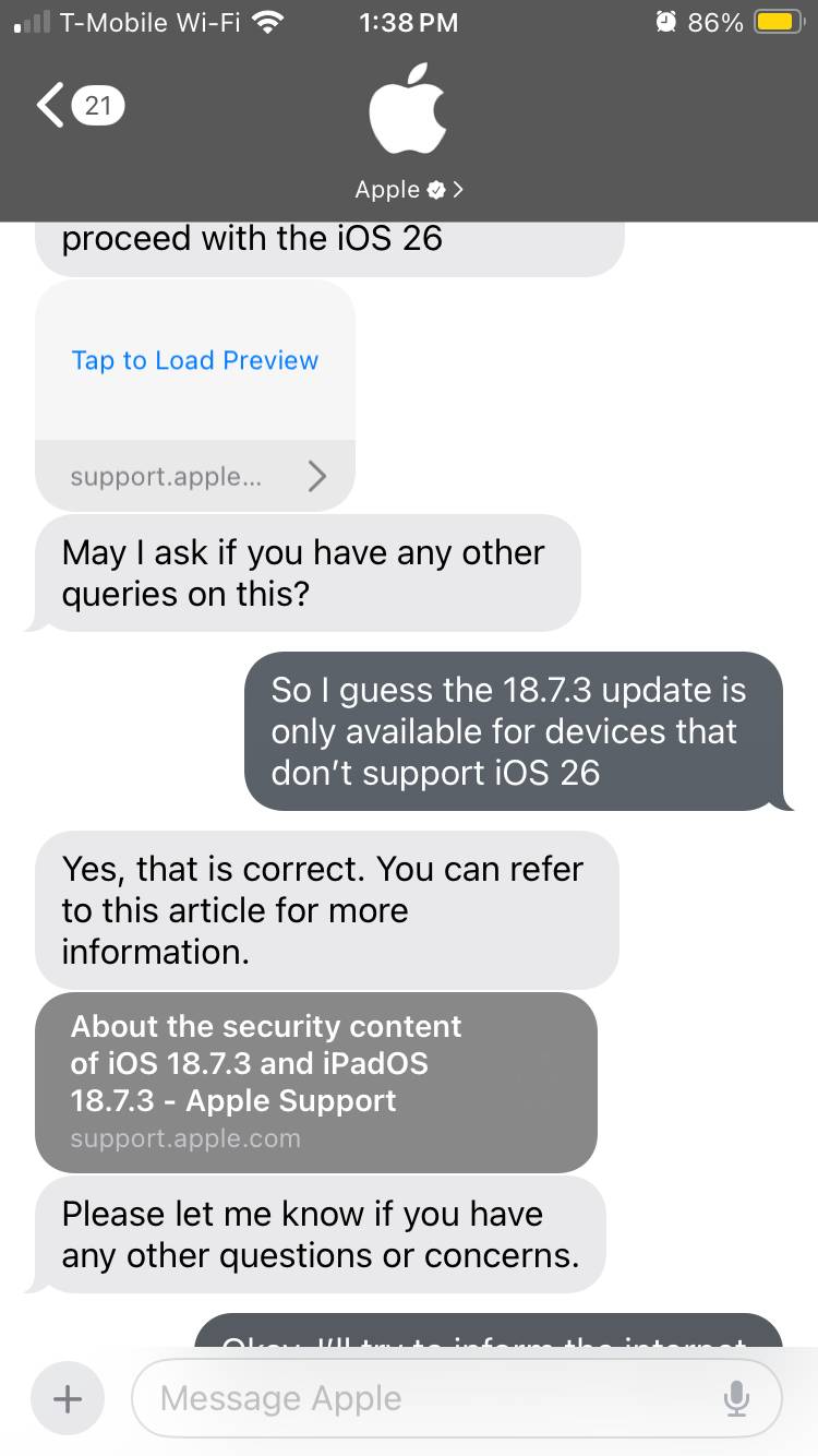 Otro detalle que llama la atención es que esta actualización estuvo disponible como beta, por lo que, en teoría, podrías instalarla si activas el programa beta de iOS 18.7. Esta sería la única alternativa para quienes tienen un iPhone compatible con iOS 26 y se niegan a actualizarlo. Un representante de soporte de Apple ha explicado que iOS 18.7.3 solo está disponible para dispositivos que no admitan iOS 26.