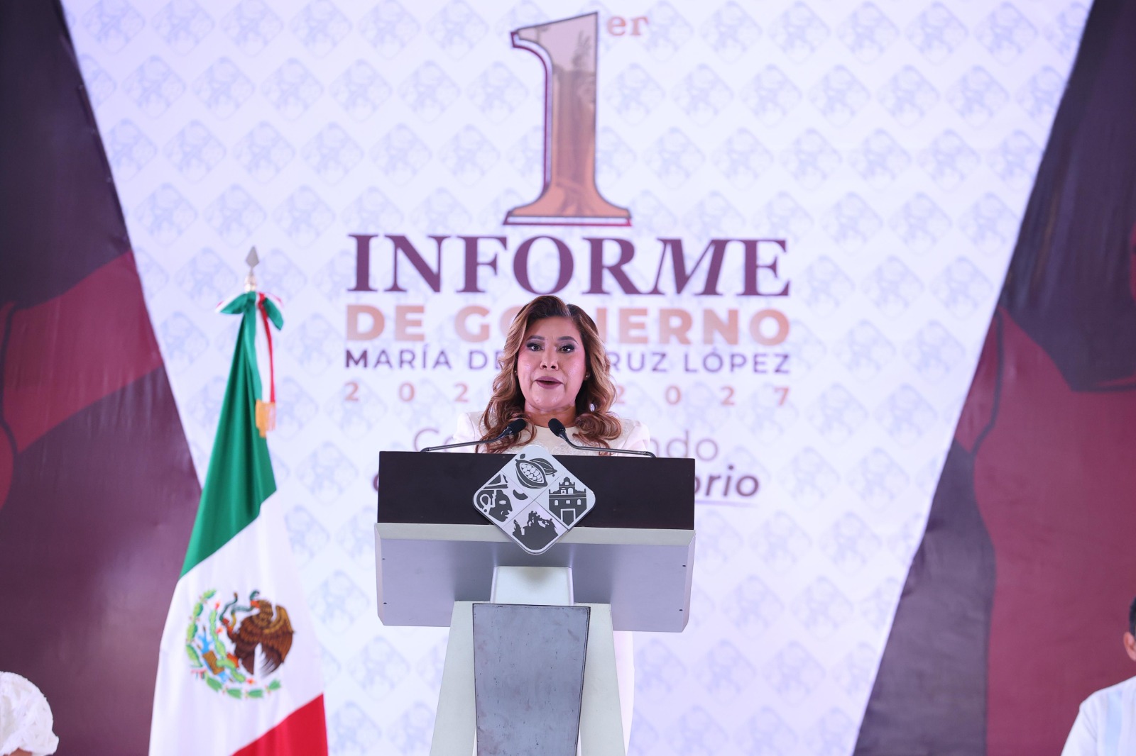 En la presentación de su informe, María de la Cruz López hizo énfasis en los logros obtenidos durante este primer año de gobierno, como la entrega de viviendas dignas por parte del municipio, el otorgamiento de vales a favor de la educación, y la organización de festivales que impulsaron la economía de las familias cunduacanenses, entre otros.