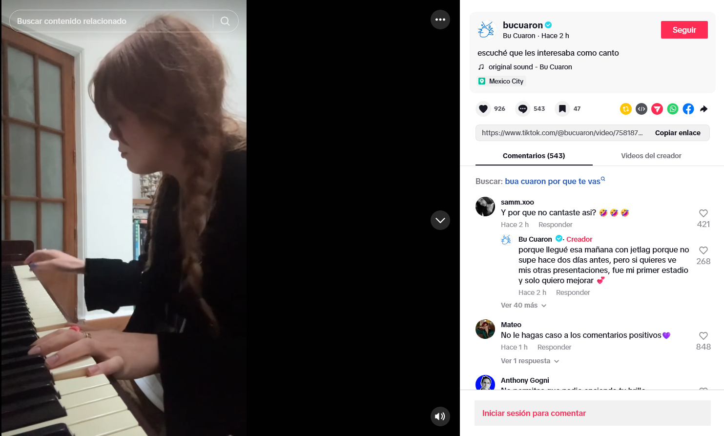 Ante ese escenario, Bu decidió no quedarse callada. Compartió un video en redes donde aparece cantando y tocando al piano el tema por el que había recibido críticas —Porque te vas— acompañada de un mensaje desafiante: “Escuché que les interesaba cómo canto”. El gesto reavivó el debate: algunos usuarios consideraron que demostraba humildad y valentía, mientras otros insistieron en sus críticas señalando que ese clip no bastaba para reivindicar un desempeño cuestionado.