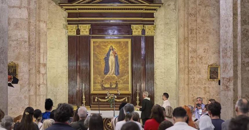 Miami/Tres cuerpos se aferran a una barca mínima en medio de un mar agitado. No hay horizonte claro, solo el vaivén de las olas y la fragilidad de la madera que los sostiene. Sobre ellos, elevada pero no distante, una figura luminosa observa y protege. No es una escena del Evangelio ni un episodio congelado en la iconografía colonial: es una imagen que dialoga de frente con la experiencia cubana contemporánea. Así se presenta Un retablo para la Virgen de la Caridad, la obra que el artista William Acosta inauguró el pasado noviembre en la catedral de La Habana, y que desde entonces acompaña, en silencio elocuente, a quienes llegan al templo.
