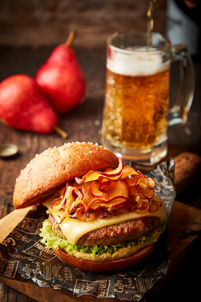 | Hamburguesas con peras y cebollas caramelizadas |