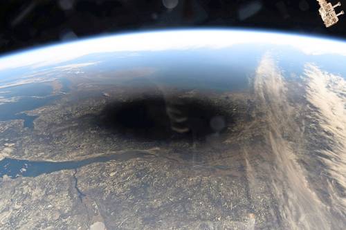 ▲ Imagen proporcionada por la NASA que muestra la sombra de la Luna cubriendo partes de Canadá y Estados Unidos durante un eclipse solar total visto desde la Estación Espacial Internacional.Foto Ap