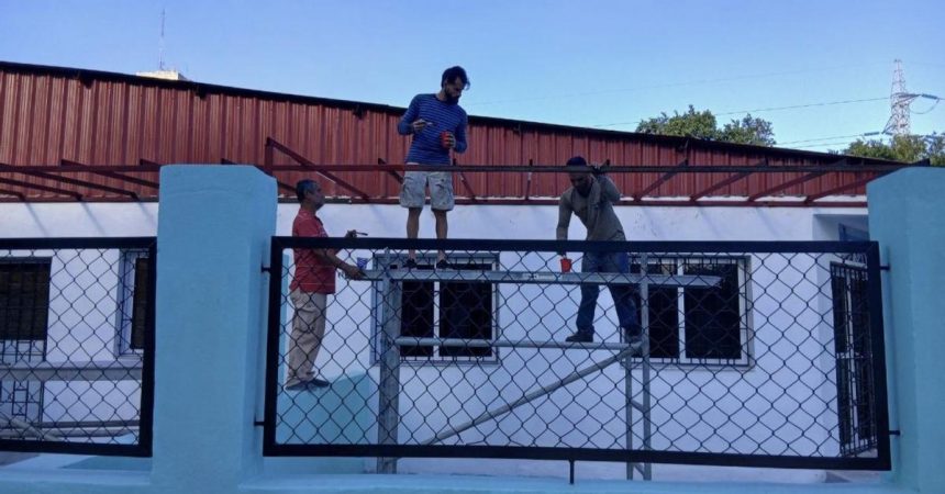 Aunque la fachada luce recientemente pintada en tonos azulados, varios obreros aún laboran en la estructura exterior. Sobre un andamio improvisado, trabajadores aplican pintura, colocan refuerzos y terminan elementos que, en una inauguración formal, deberían estar concluidos. “A esto todavía le faltan días para estar terminado”, confirma a 14ymedio uno de los operarios.