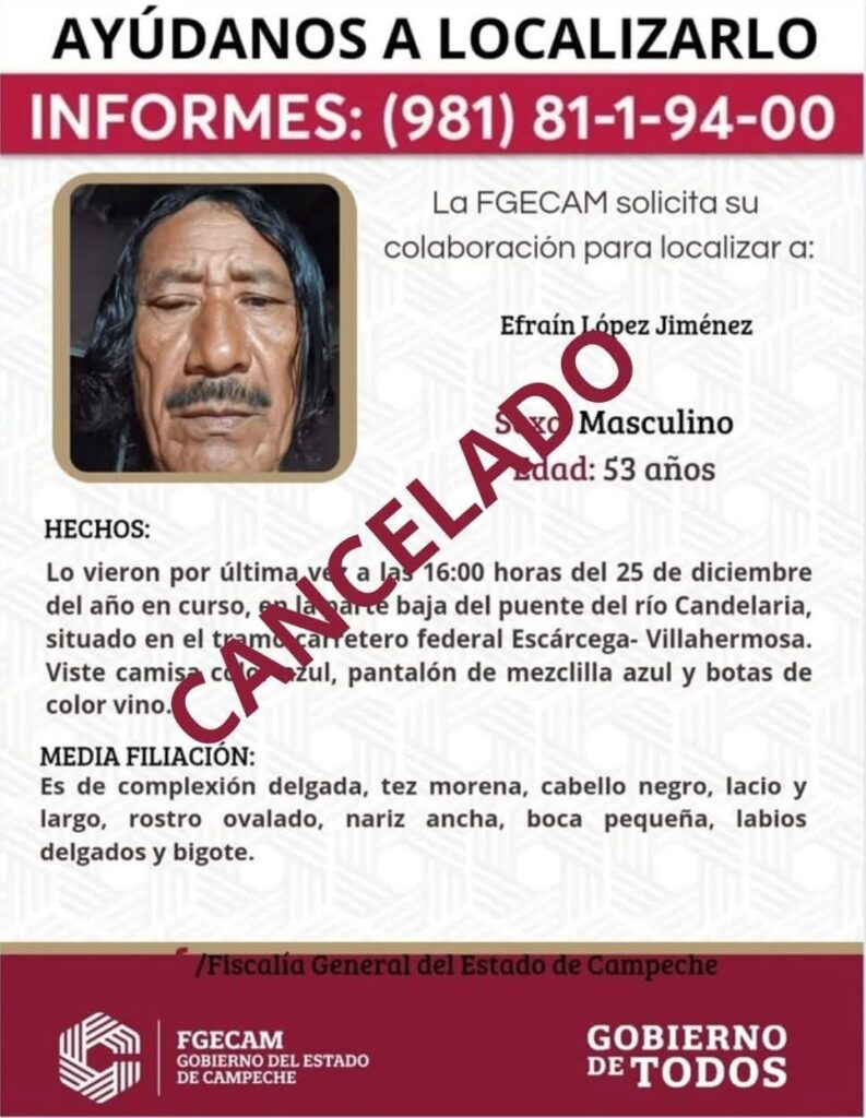 La Fiscalía General del Estado de Campeche había emitido una ficha de búsqueda desde la mañana de ese mismo domingo; sin embargo, horas más tarde fue difundida nuevamente con la leyenda de “cancelado”.