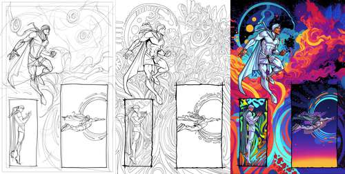 ▲ Boceto, dibujo completo a línea de tinta y viñeta coloreada de Kalimán: El despertar, historieta realizada por el guionista Alfredo Rodríguez, Karmix; el dibujante Ricardo Osnaya y el colorista Ulises Grostieta.Foto tomada de la página de Ricardo Osnaya en la plataforma Substack